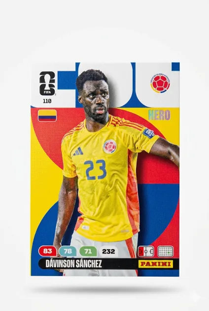 Carta Adrenalyn XL #110 de Davinson Sánchez que pertenece al Mundial de Fùtbol 2026. Compra tus cartas individuales en Ninfas y encuentra fácilmente esa carta que te faltan para completar tu álbum de fútbol
