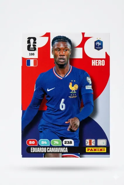 Carta Adrenalyn XL #186 de Eduardo Camavinga que pertenece al Mundial de Fùtbol 2026. Compra tus cartas individuales en Ninfas y encuentra fácilmente esa carta que te faltan para completar tu álbum de fútbol