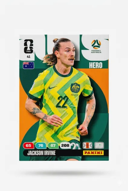 Carta Adrenalyn XL #41 de Jackson Irvine que pertenece al Mundial de Fùtbol 2026. Compra tus cartas individuales en Ninfas y encuentra fácilmente esa carta que te faltan para completar tu álbum de fútbol