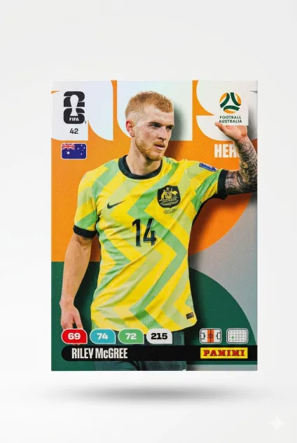 Carta Adrenalyn XL #42 de Riley McGree que pertenece al Mundial de Fùtbol 2026. Compra tus cartas individuales en Ninfas y encuentra fácilmente esa carta que te faltan para completar tu álbum de fútbol