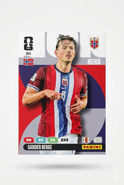Carta Adrenalyn XL #341 de Sander Berge que pertenece al Mundial de Fùtbol 2026. Compra tus cartas individuales en Ninfas y encuentra fácilmente esa carta que te faltan para completar tu álbum de fútbol