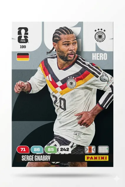 Carta Adrenalyn XL #199 de Serge Gnabry que pertenece al Mundial de Fùtbol 2026. Compra tus cartas individuales en Ninfas y encuentra fácilmente esa carta que te faltan para completar tu álbum de fútbol
